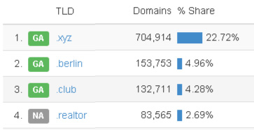 .xyz稳占据新顶级域名注册排行榜首位
